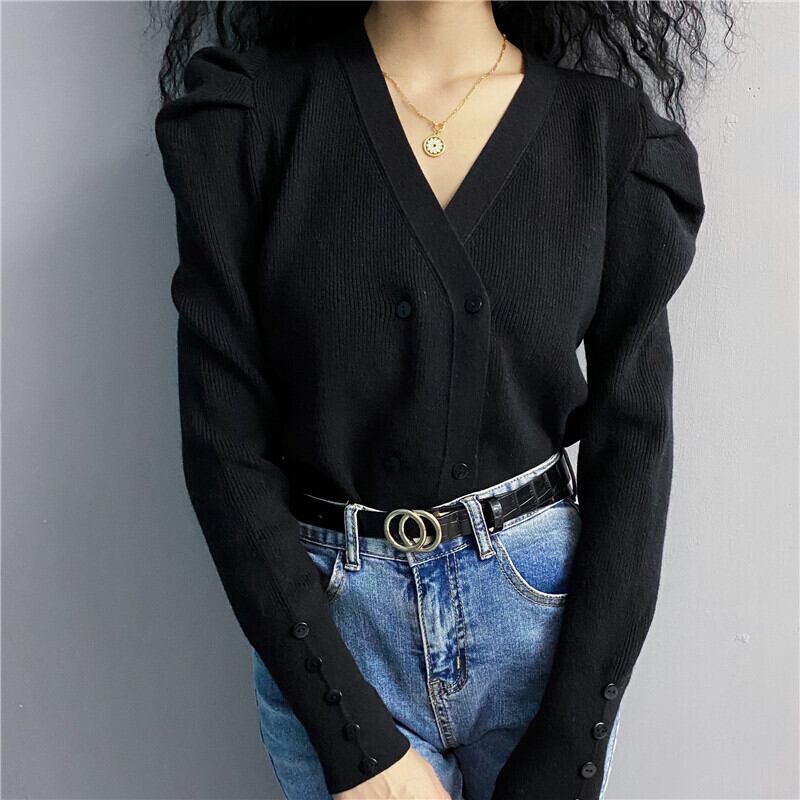 Vネック セーター カーディガン パフスリーブ ダブルブレスト フレンチレトロ 2カラー a1543