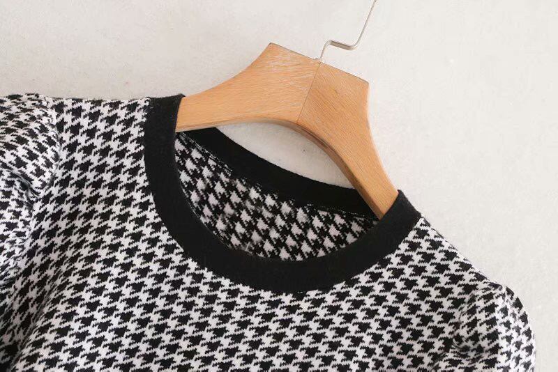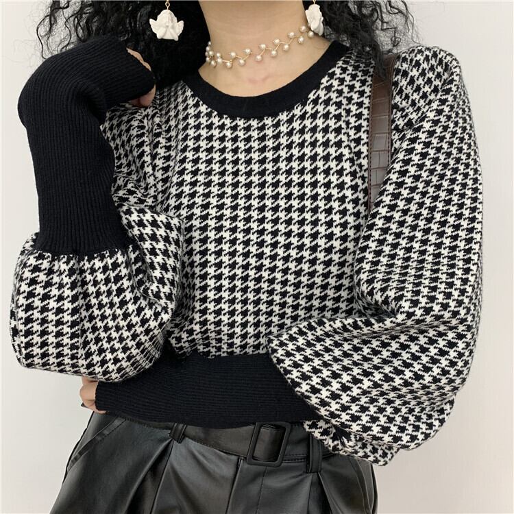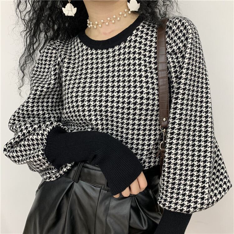 千鳥格子セーター トップス フレンチレトロ ラウンドネック プルオーバー ランタンスリーブ a1544