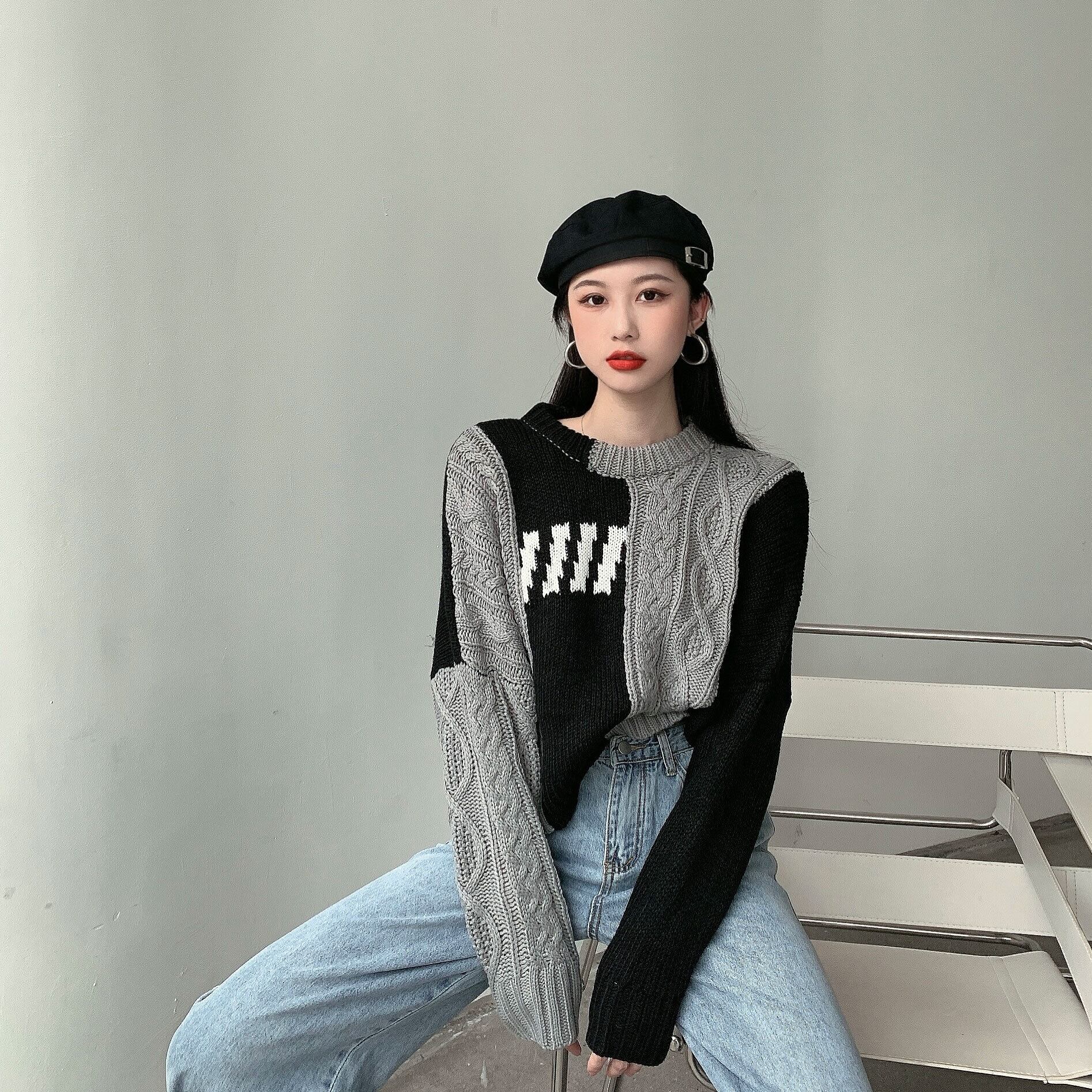 ツイスト ニット セーター 長袖セーター リブ編み バイカラー レディース プルオーバー ルーズ 秋冬 韓国 2カラー a1546