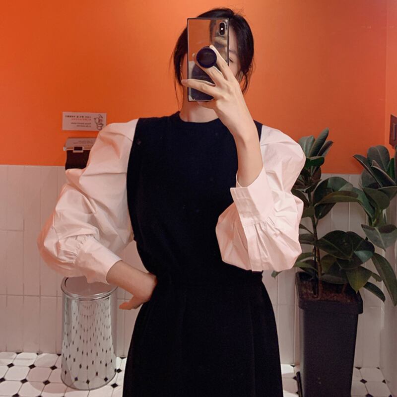 フェイクツーピース ニットワンピース ランタンスリーブ ドレス ラウンドネック 韓国 2カラー a1600