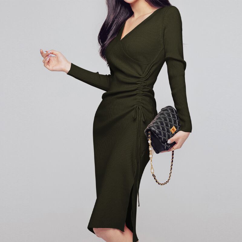 ニットドレス 長袖 Vネック ボトムオープンフォーク セータースカート A900