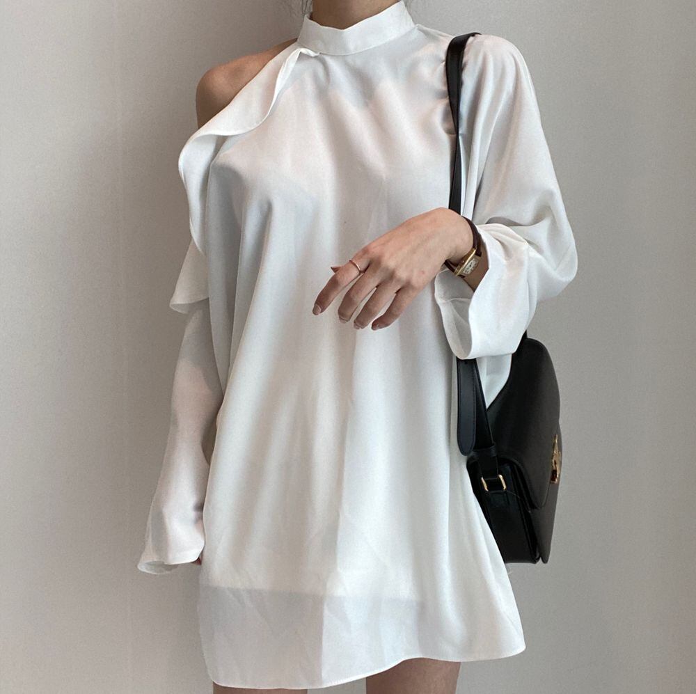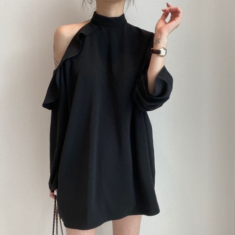 ウエストレースアップ長袖シャツ スタンドカラー ストラップレス フリル 2カラー a1606