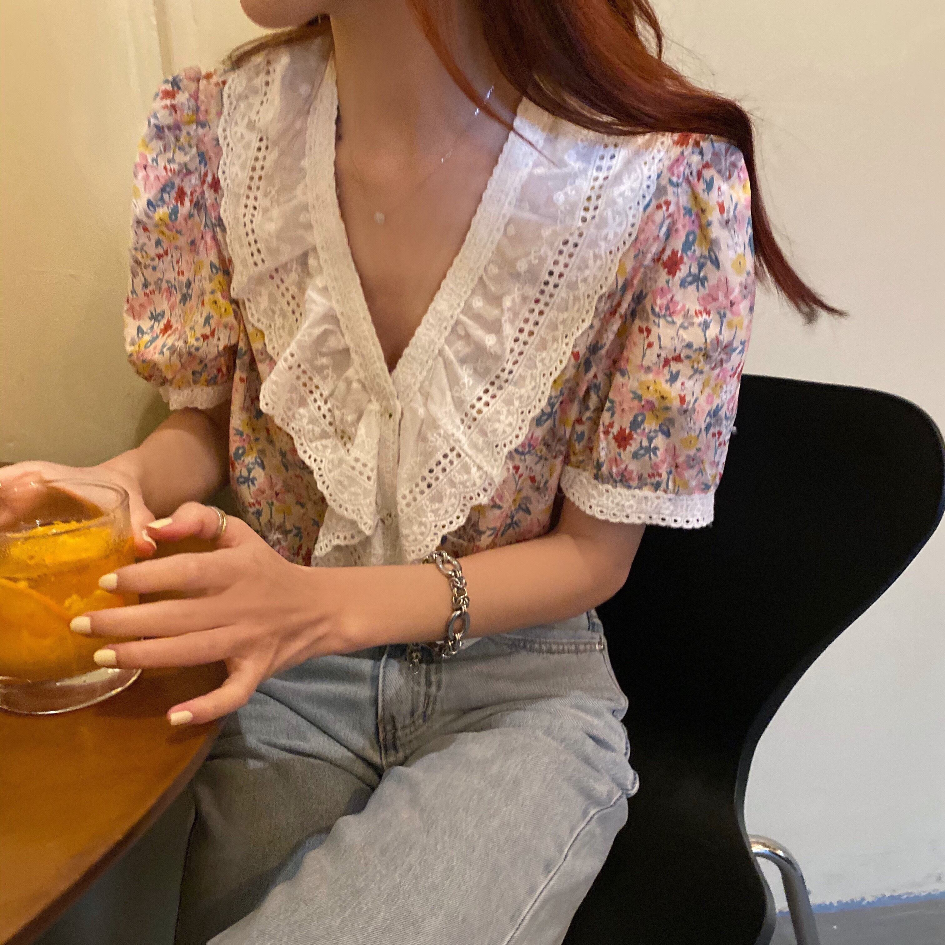 花柄 Vネック 半袖 シャツ ブラウス 2パターン A3289
