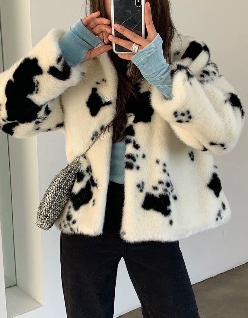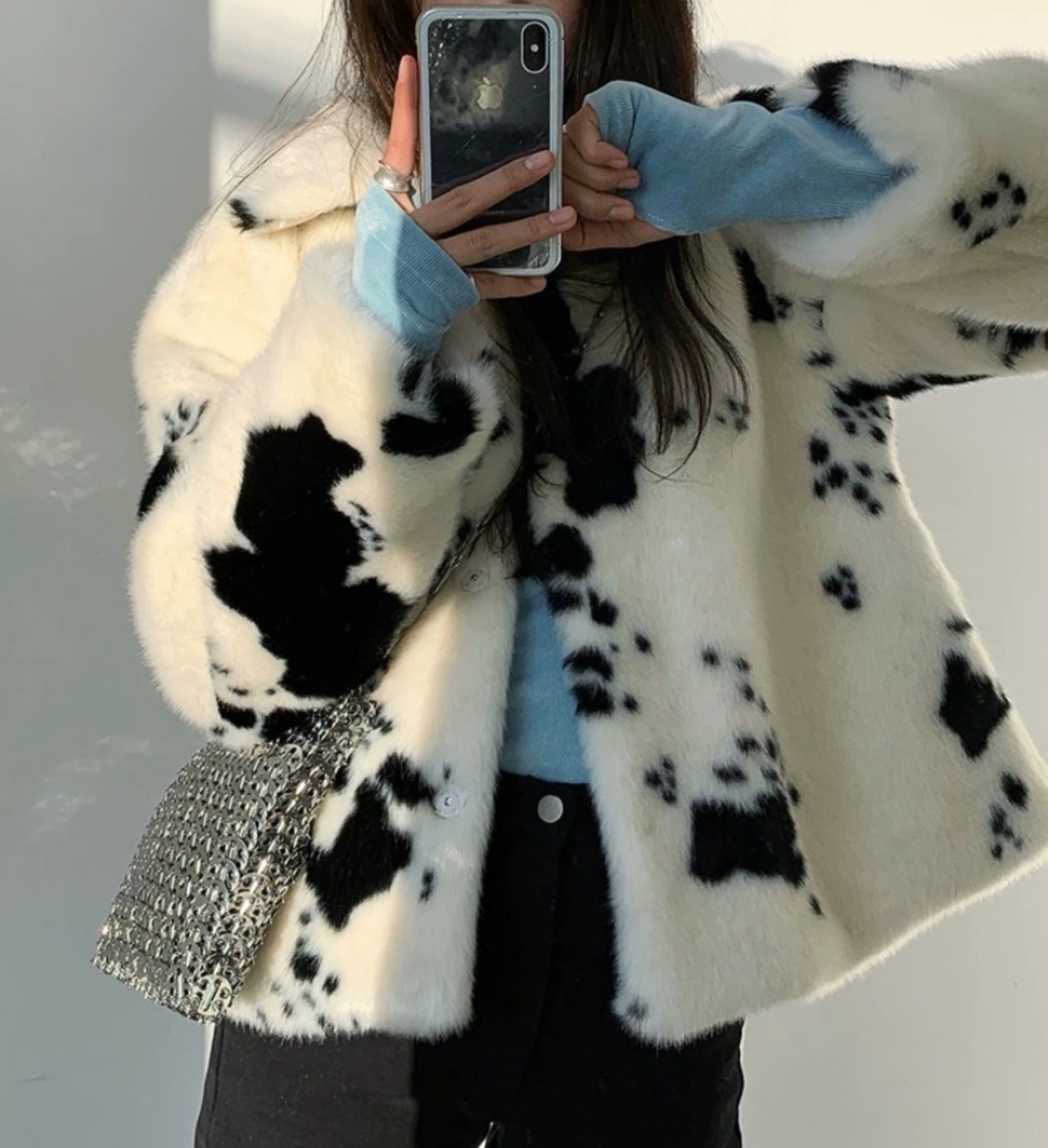 カウ柄 ウールコート ファージャケット 韓国 冬 ルーズ ラペル ウエスタンスタイル a1703