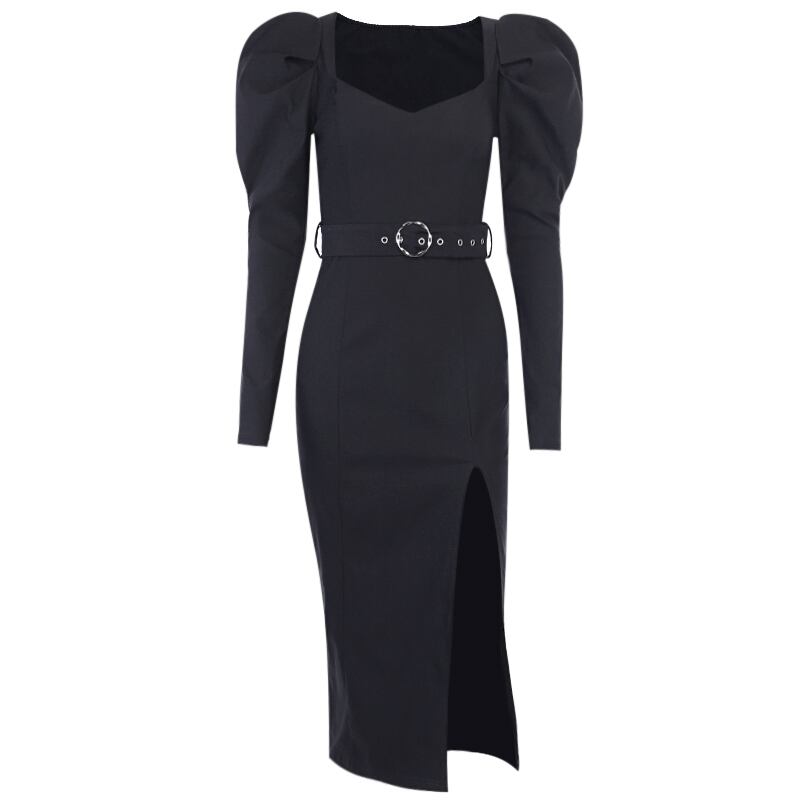 【ベルト付き】パフスリーブドレス スクエアカラー Hタイプ ハイウエスト ワンピース ドレス セクシー スリット a1716