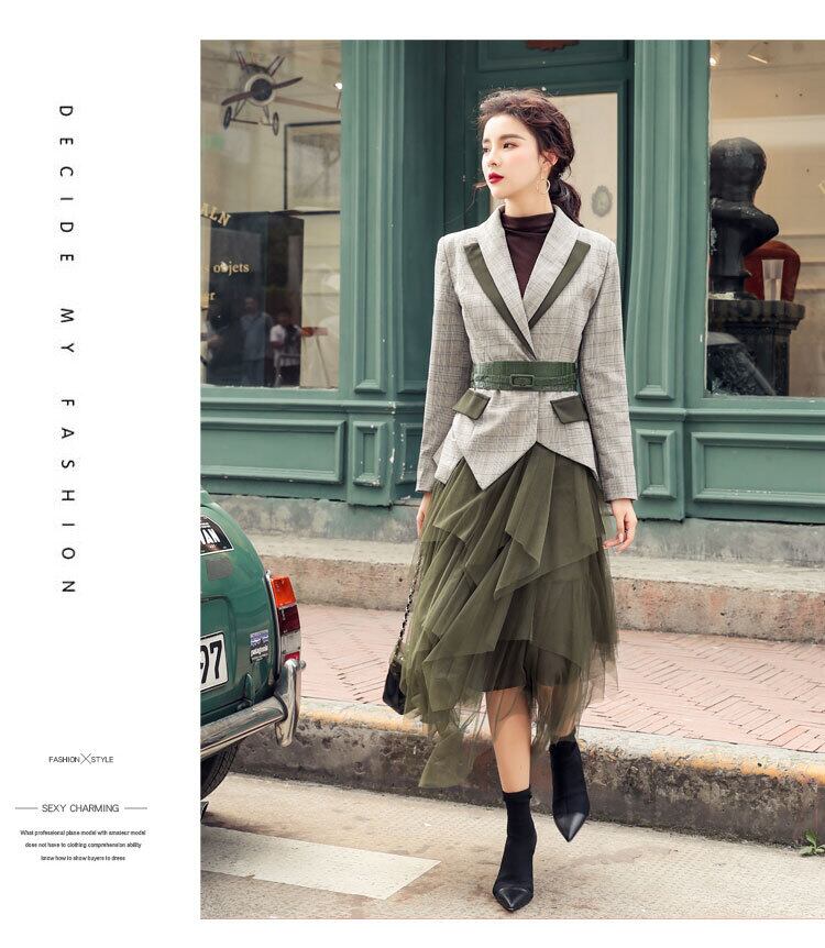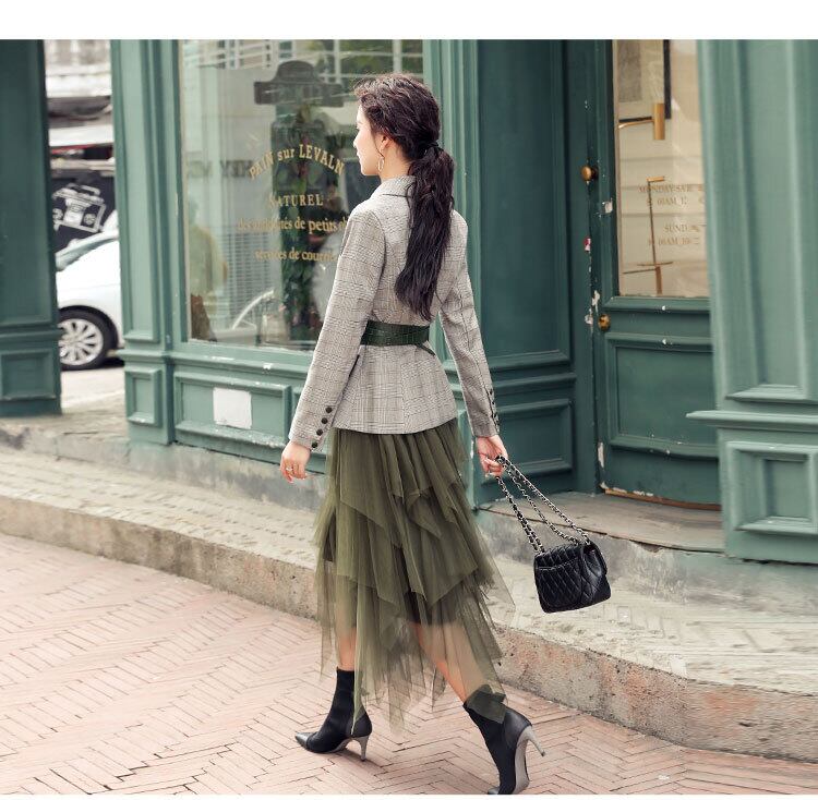 【セットアップ】チェック柄ブレザー+シフォンスカート ツーピース ファッションスーツ ジャケット ハイウエスト a1841