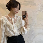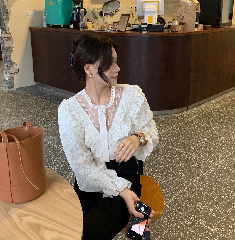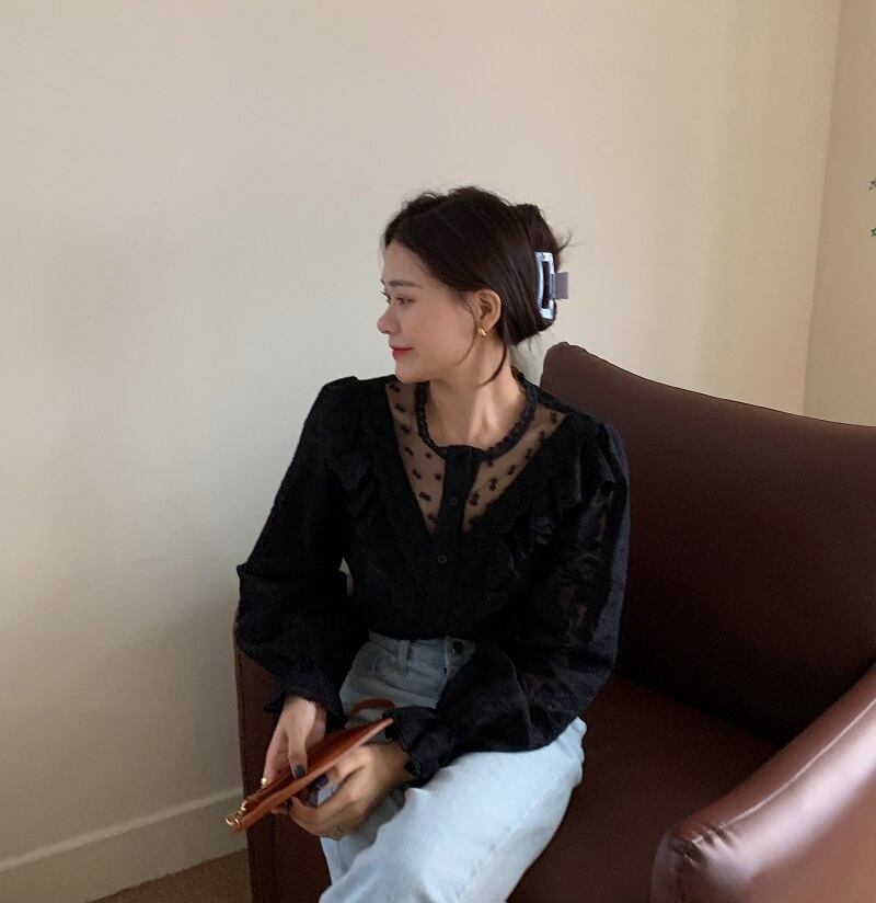 シースルーレースブラウス フレンチレトロ ラウンドネック ブラウス ルーズ フレアスリーブ 韓国 2カラー a1905