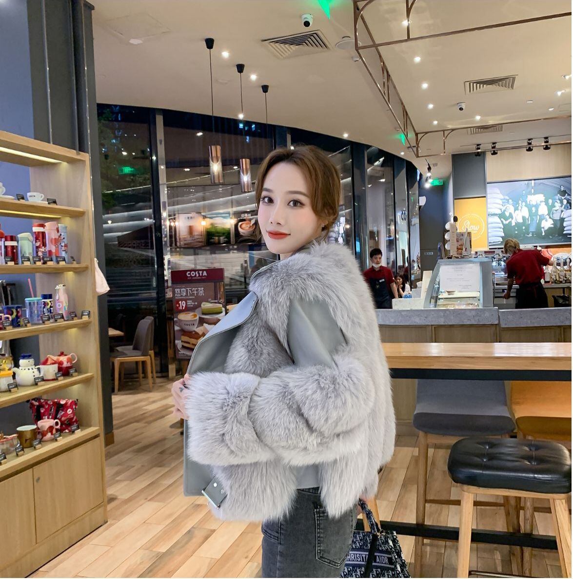 イミテーションフォックスファーライダースコート ショート丈 秋冬 ファーコート ライダースジャケット スクエアカラー 韓国 3カラー a2030