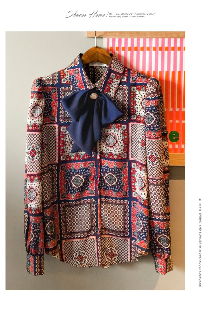 ペリズリー柄 ボウノットシャツ レトロ プリント リボン ブラウス デザインニッチ a2196