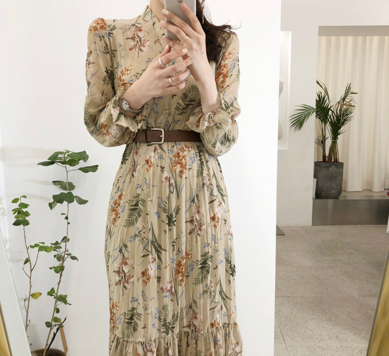 【ベルト付き】Vネックフローラルシフォンワンピース