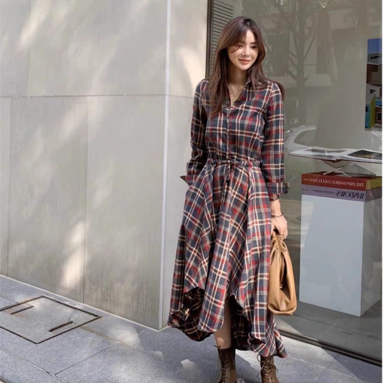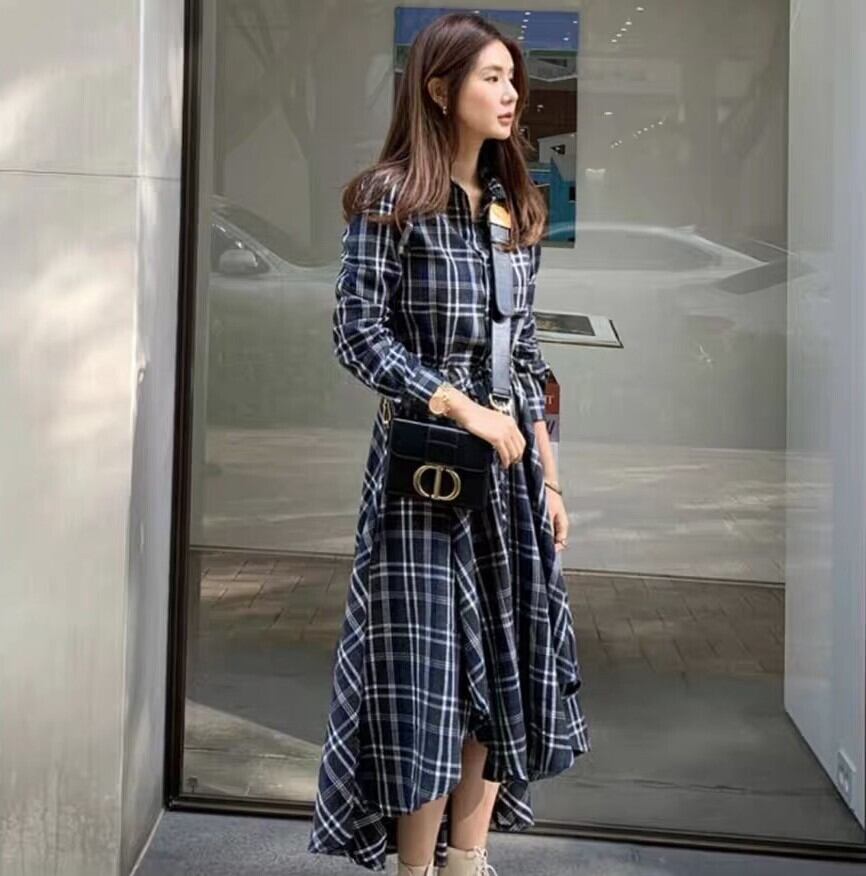 長袖チェック柄シャツワンピース ウエスタンスタイル ウエストスリミング レトロ ワンピース ミモレ丈 a2225