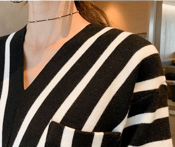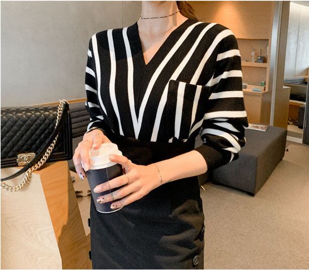 Vネックストライプセーター ボーダーニット 秋冬 ウェア ルーズ&シンロングスリーブ a2246