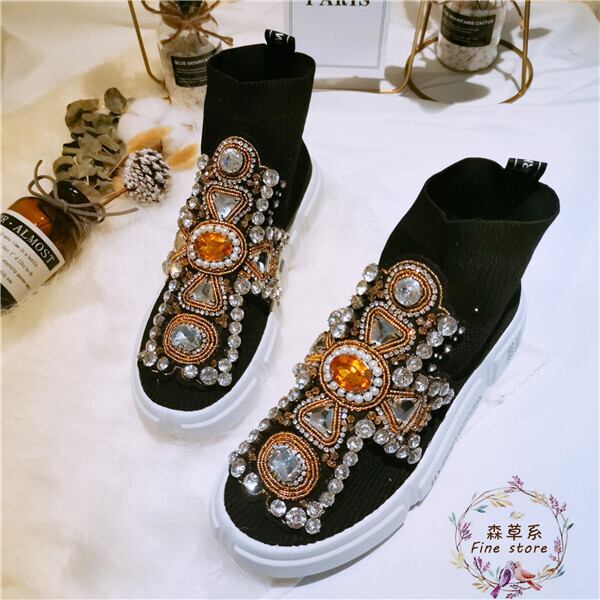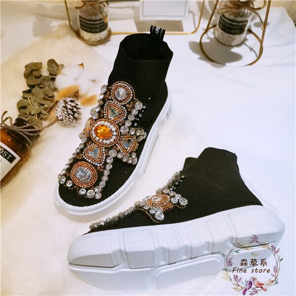 ラインストーン ソックスシューズ ニットストレッチ カジュアルハイトップスニーカー レディース a2360