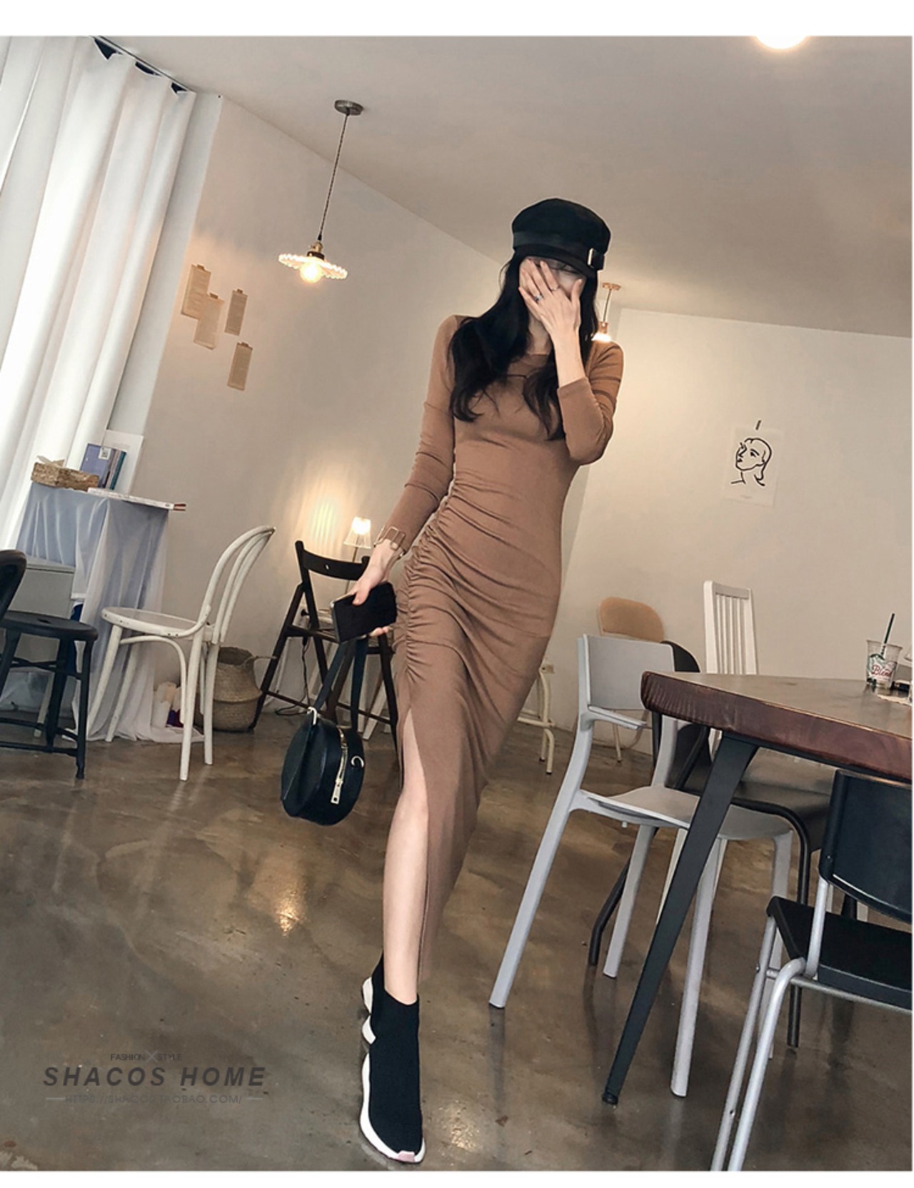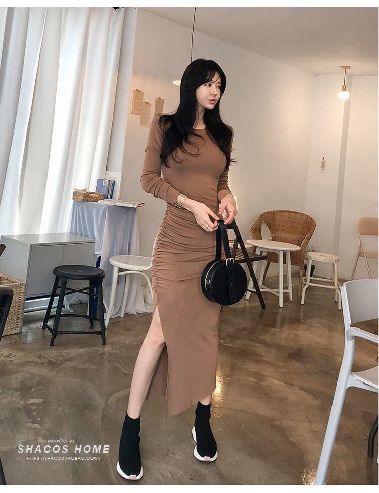 長袖プリーツワンピース ヒップ タイトワンピ ドレス スリムフィット 秋冬 韓国 オルチャン ワンピース a2254