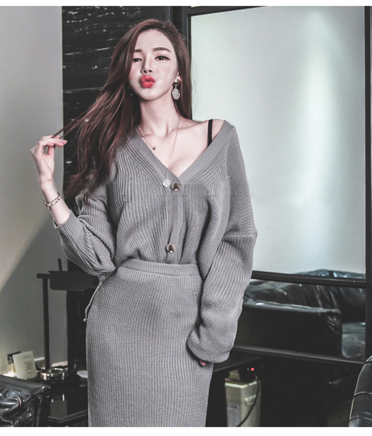 【セットアップ】Vネックルーズカーディガン+ニットスカート