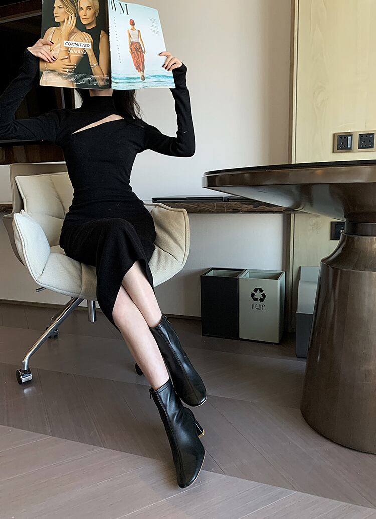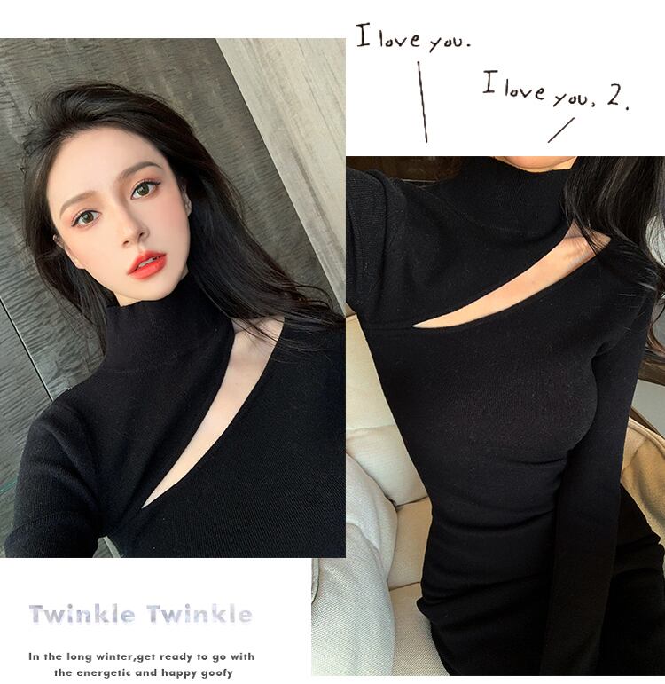 ブラックセクシーニットワンピース ハーフハイネック ニットドレス 秋冬 韓国 大人セクシー a2269