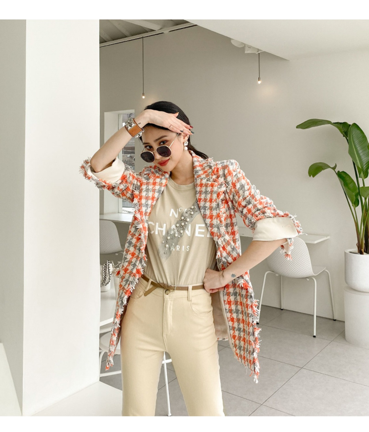 千鳥格子 ジャケット ウールブレザー ツイード柄 フリンジ ミドル丈 レディース 韓国 コート アウター a2312