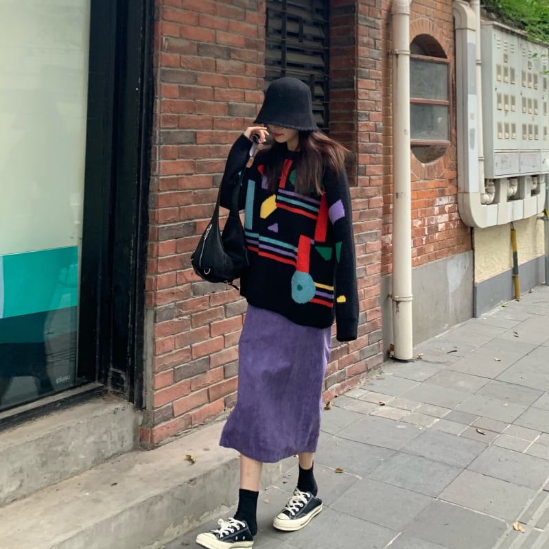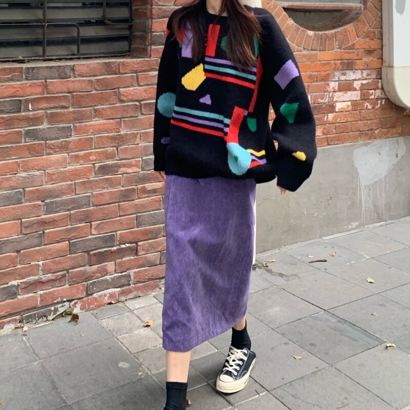 【セットアップ】幾何学柄 ニットセーター+コーデュロイ スカート ツーピース 秋冬 韓国 ルーズ 長袖 厚み プルオーバー ニット セーター a2380