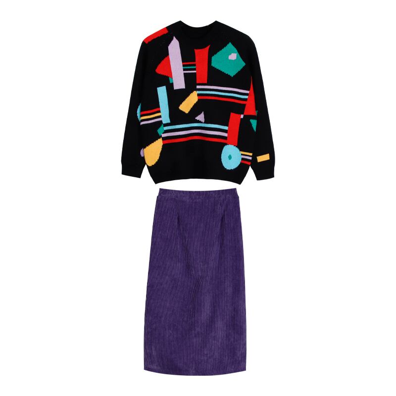 【セットアップ】幾何学柄 ニットセーター+コーデュロイ スカート