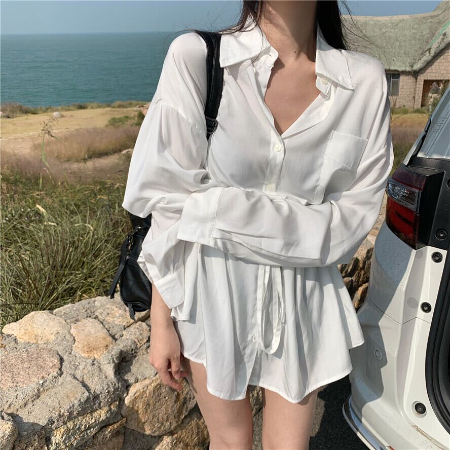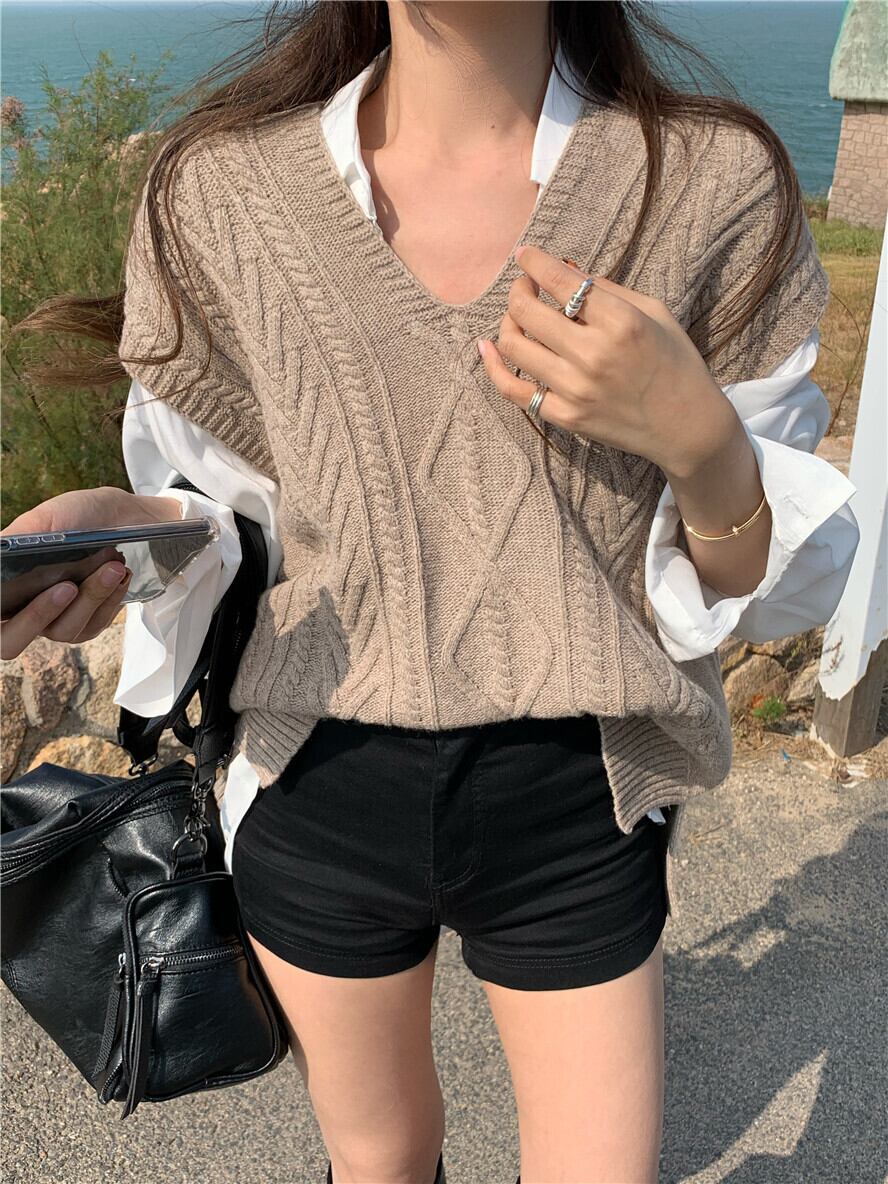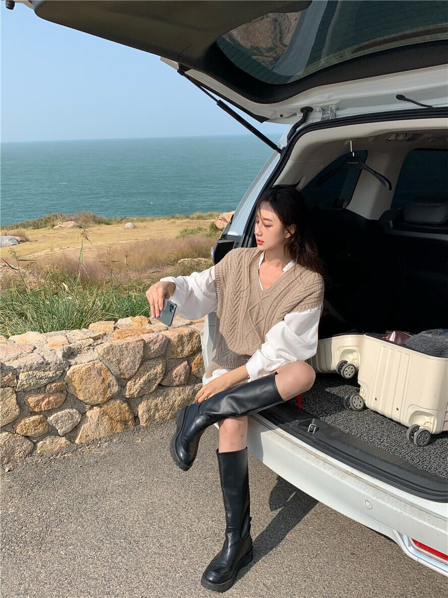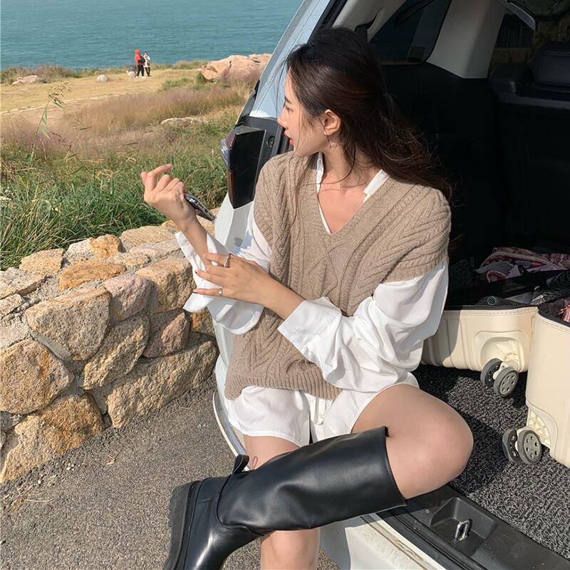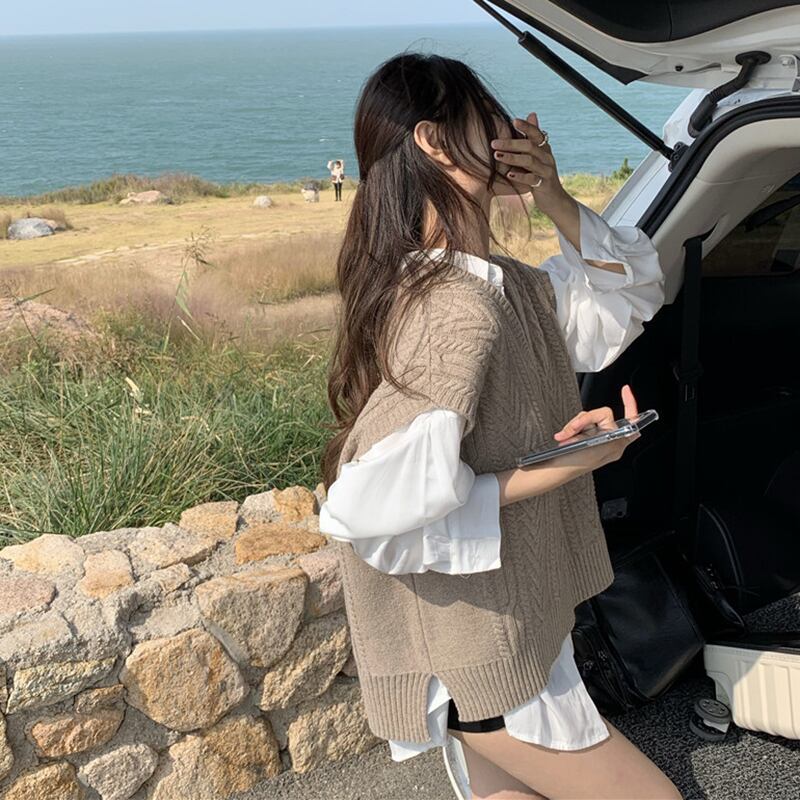 【セット】カーキベスト+ルーズシャツ セーターベスト 長袖シャツ ワンピース 韓国 秋冬 a2382