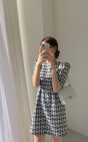 Aラインワンピース ツイード ウエストスリム 半袖ワンピース ドレス レディース シンプルスタイル レトロ 韓国 2カラー a2413