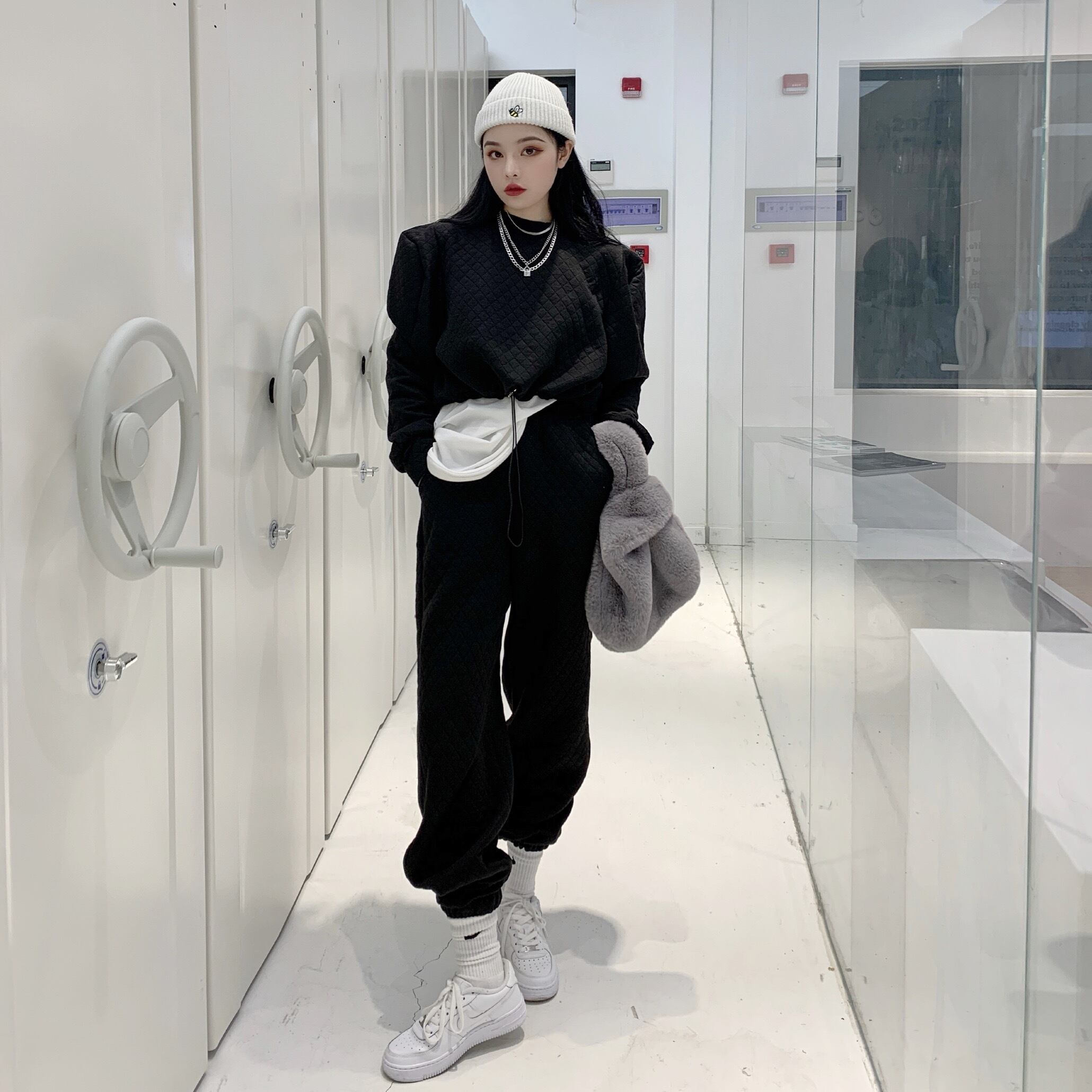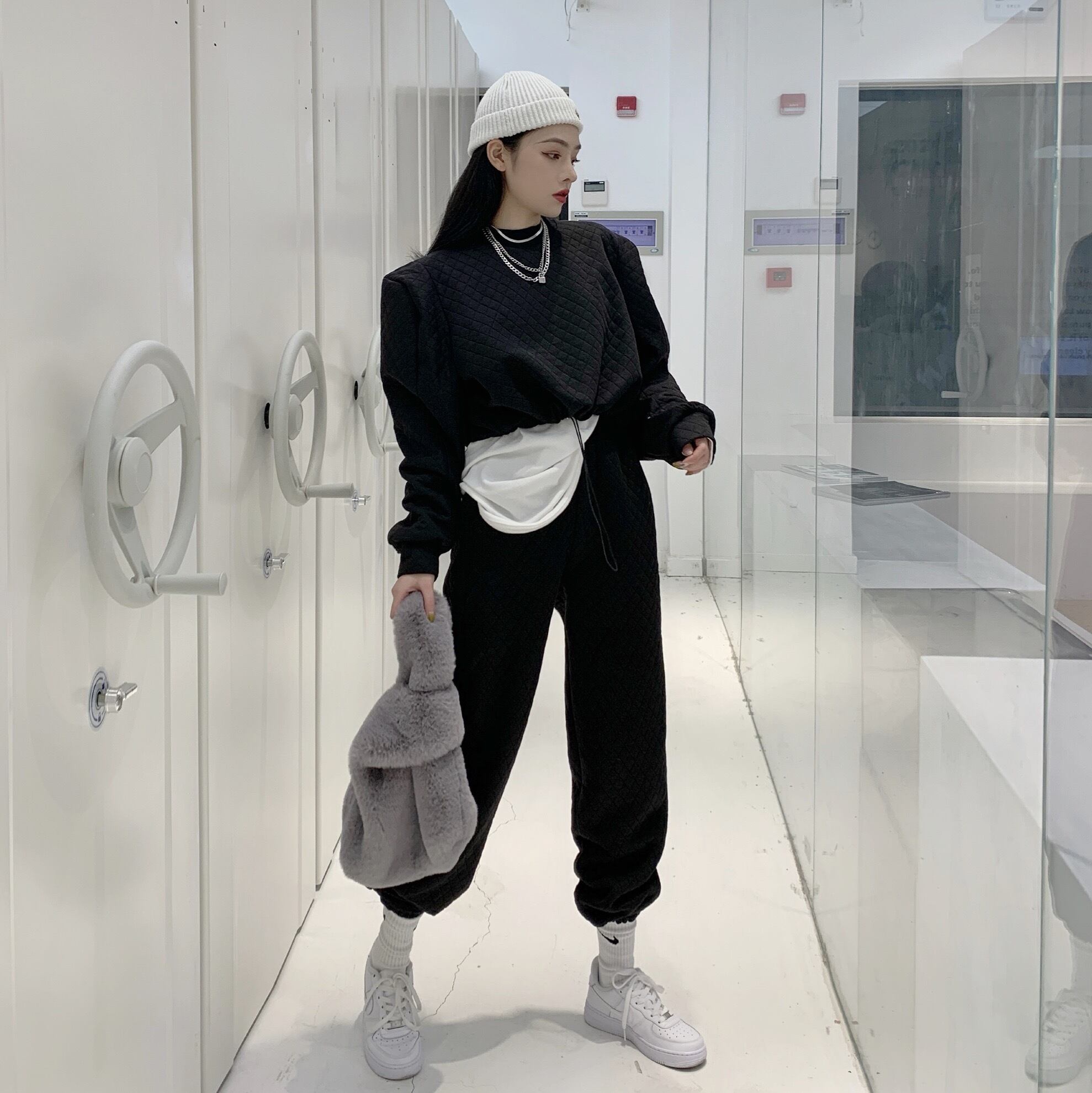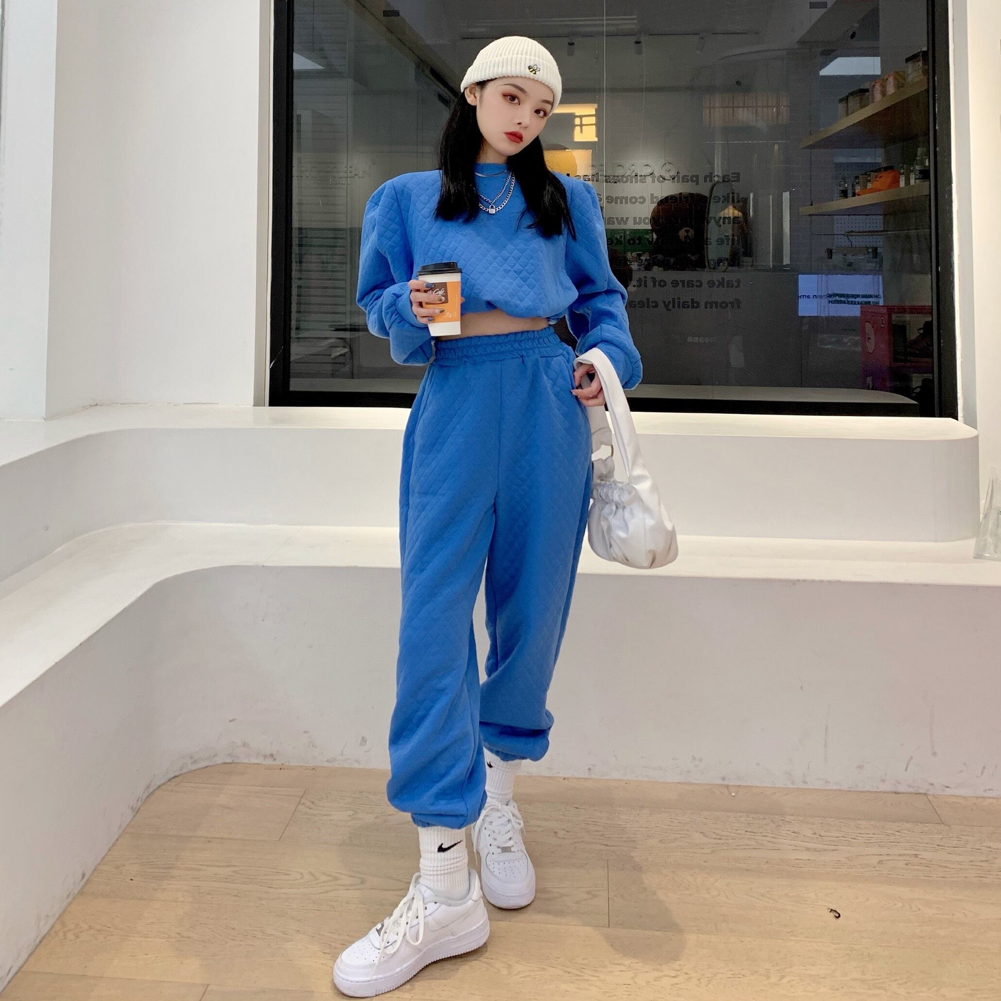 【セットアップ】ショート長袖セーター+ハイウエストパンツ キルティング ツーピース ラウンドネック スウェット 2カラー a2416