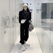 ショート丈の長袖トップスとルーズなパンツのセットアップ