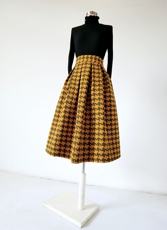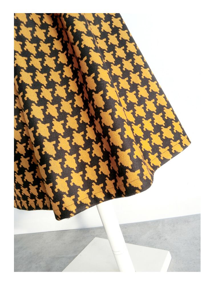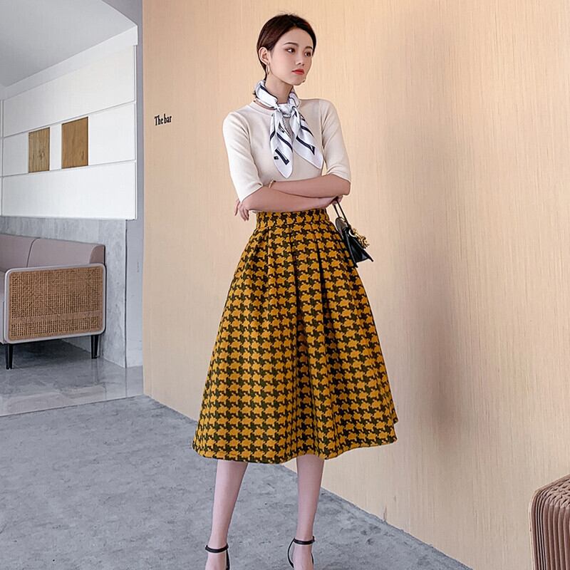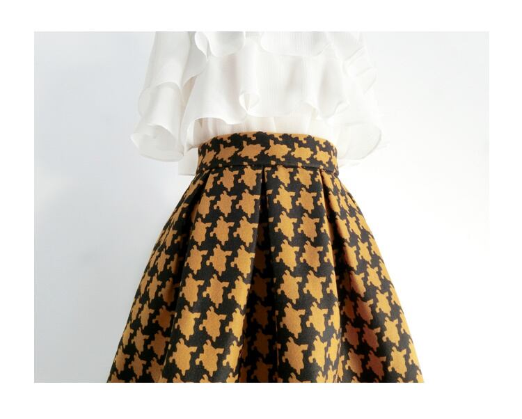 千鳥格子柄 Aラインスカート ウールスカート パフスカート ハイウエスト 秋冬 ミドル丈スカート a2433
