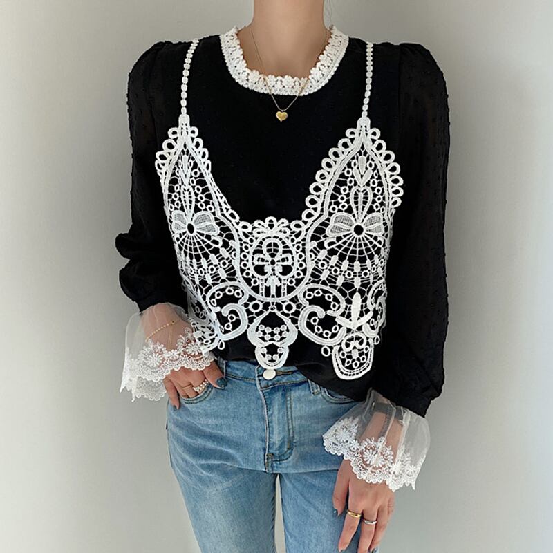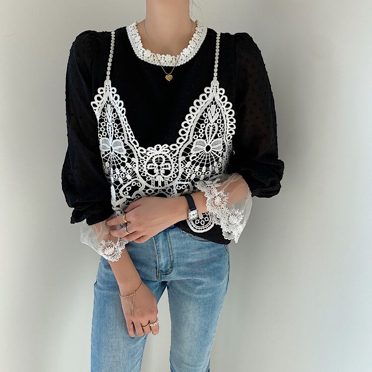 レースキャミ付きシフォンブラウス フェイクツーピースデザイン トランペットスリーブ 韓国 トップス a2485