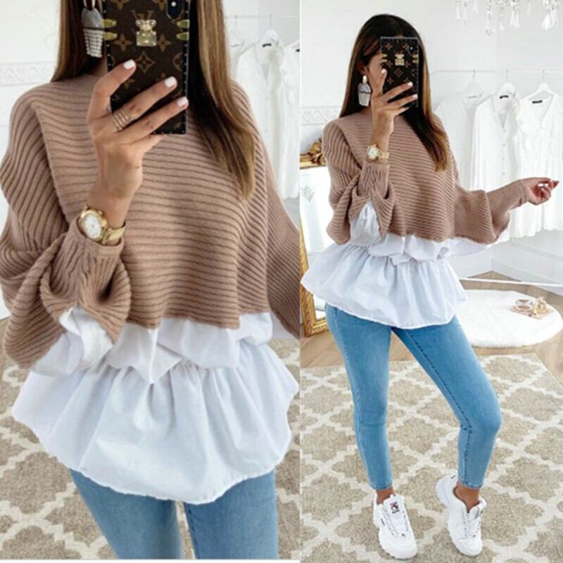 重ね着風長袖ステッチシャツ ドッキングシャツ ツーピース風 トップス レディース ランタンスリーブ シャーリングステッチ 4カラー a2519