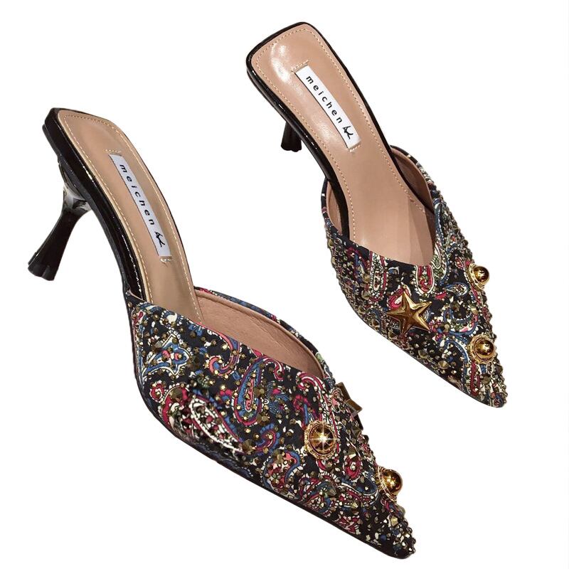 ラインストーンミュール ハイヒール ポインテッドトゥ ミュール ハーフサンダル ファインヒール 2カラー a2522