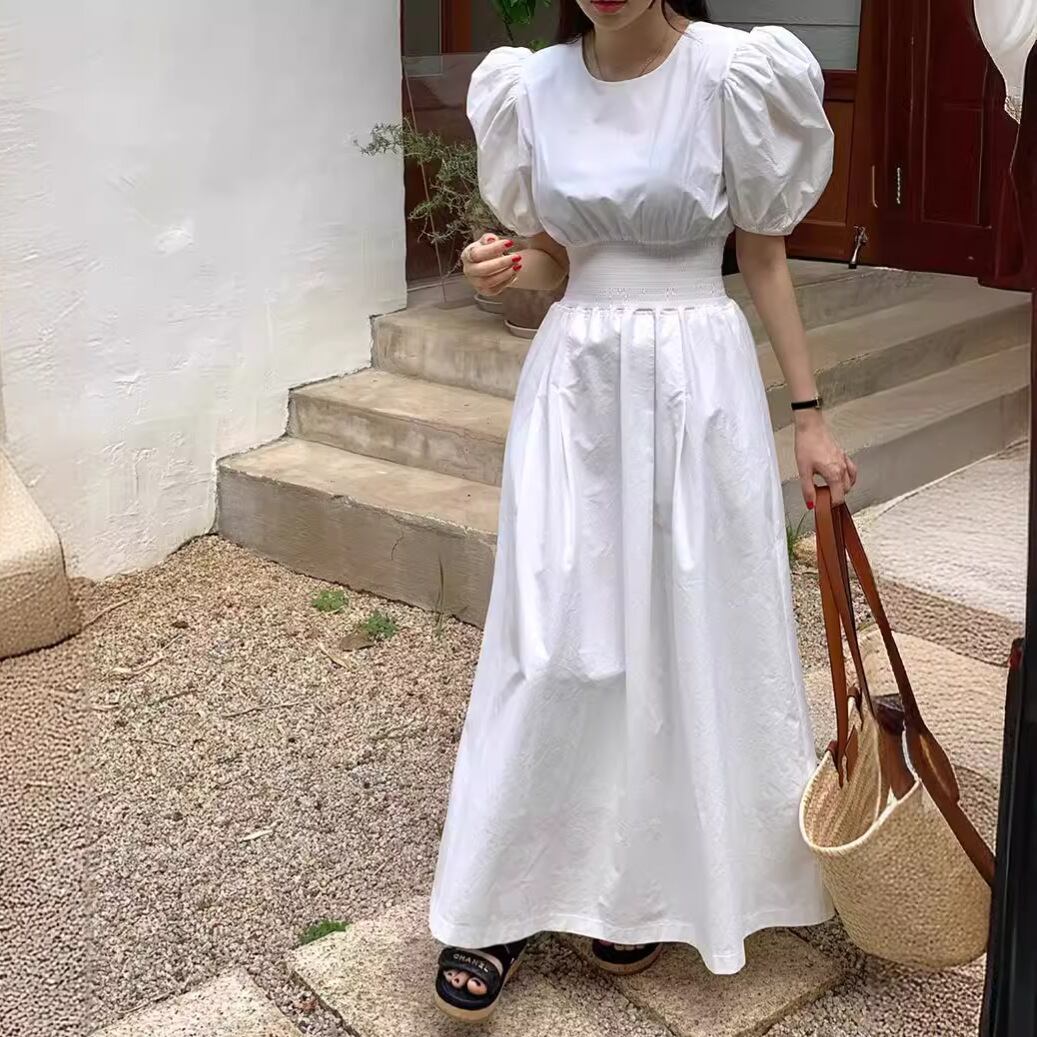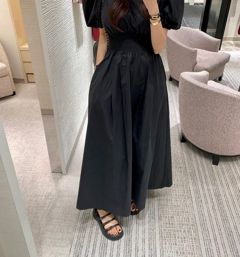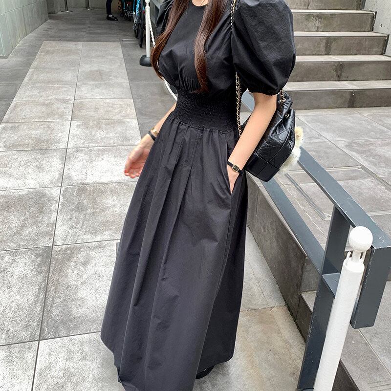 バブルスリーブロングワンピース ラウンドネック ワンピース ルーズ フォールドデザイン ハイウエスト 半袖ワンピース 韓国 2カラー a2543