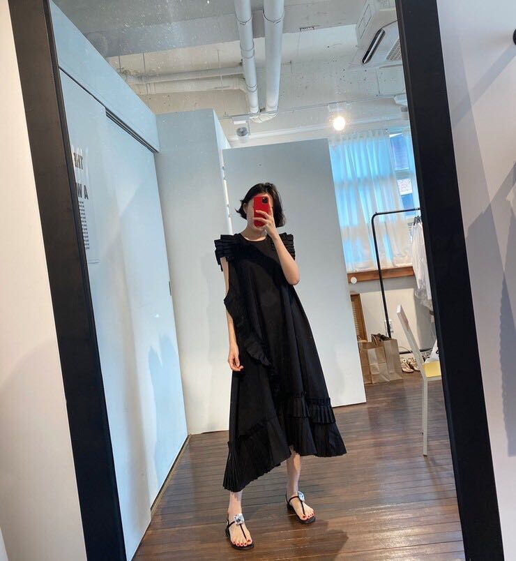 プリーツフリルワンピース イレギュラードレス ロングスカート 韓国 ラウンドネック ルーズ 無地フライングスリーブ 2カラー a2563