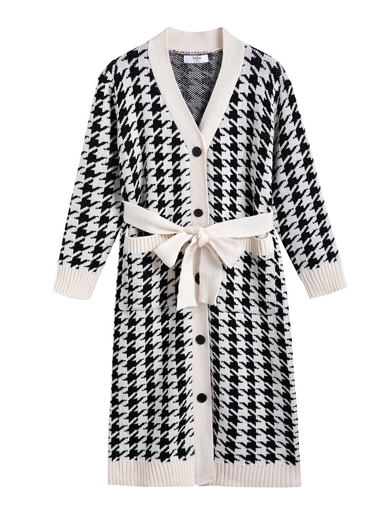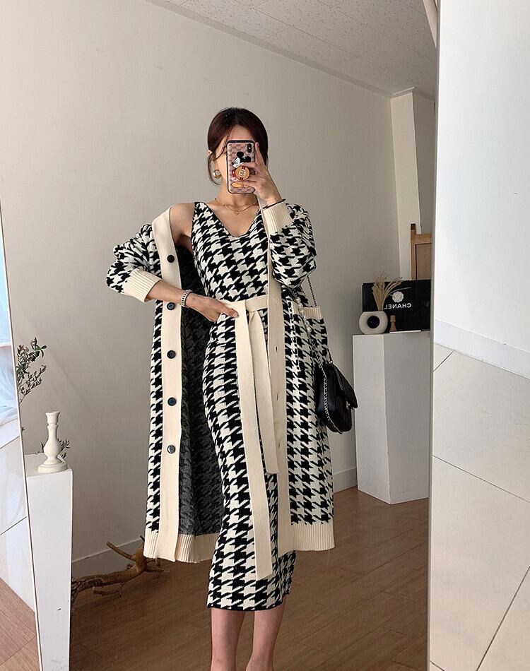 【セットアップ】千鳥格子柄ワンピース+Vネックカーディガン ルーズ エレガント 韓国 ツーピース a2579