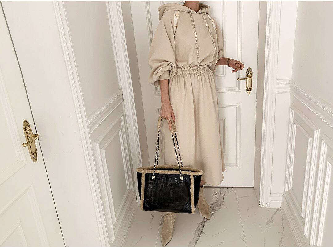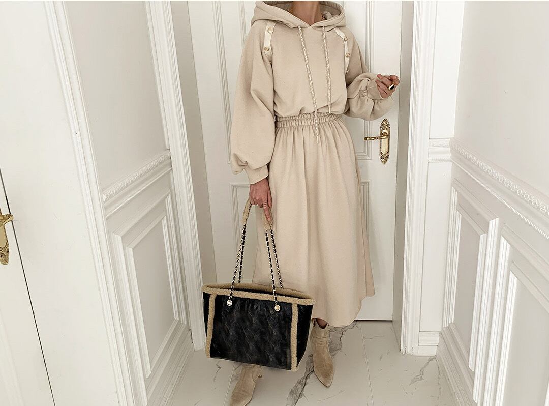 フード付きスウェットワンピース ハイウエスト ゴールドボタン ルーズ 韓国 シック 2カラー a2599