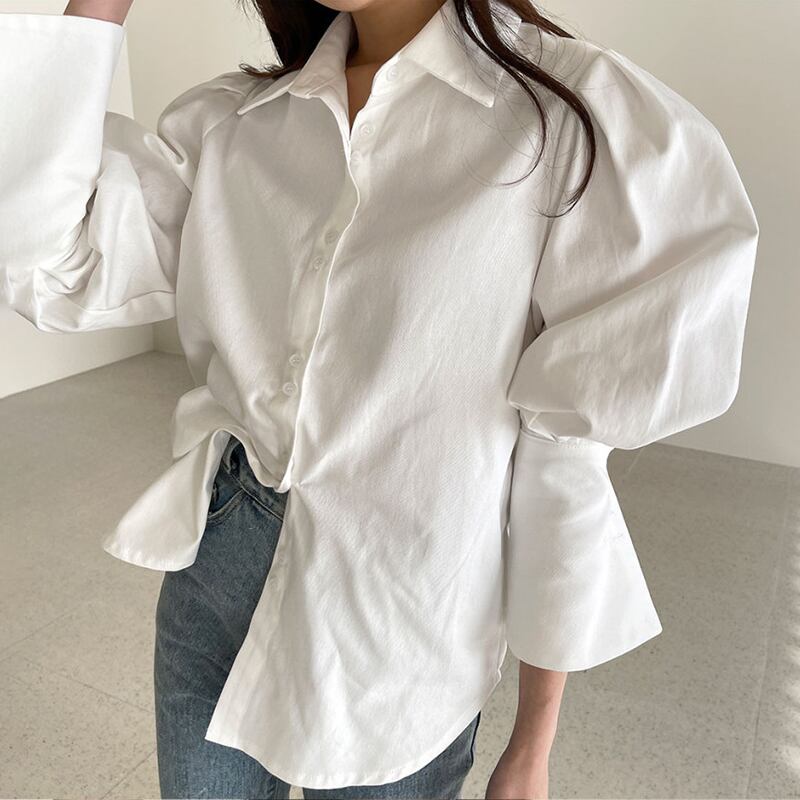 パフスリーブシャツ ワイルドベーシックラペル シングルブレスト ルーズ カジュアル シック 韓国 2カラー a2607