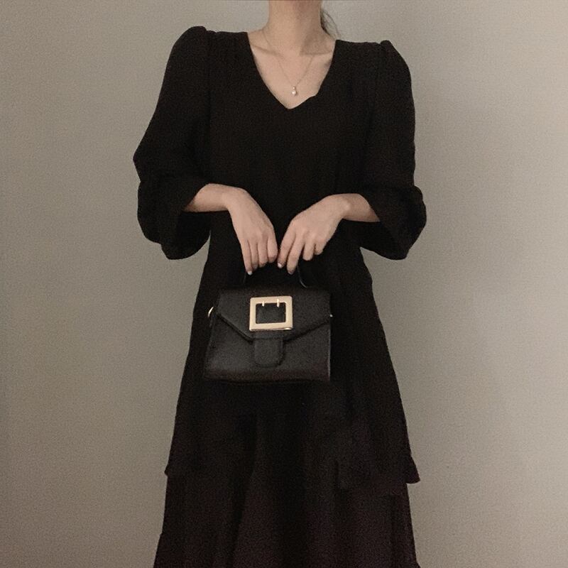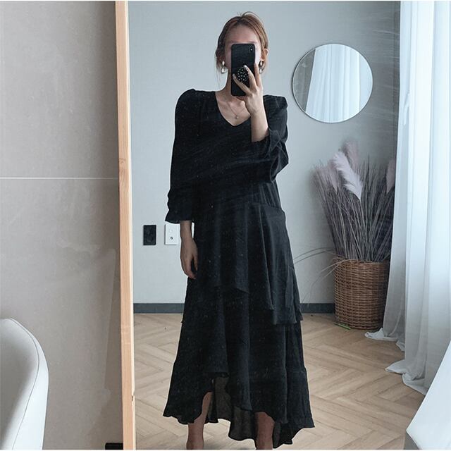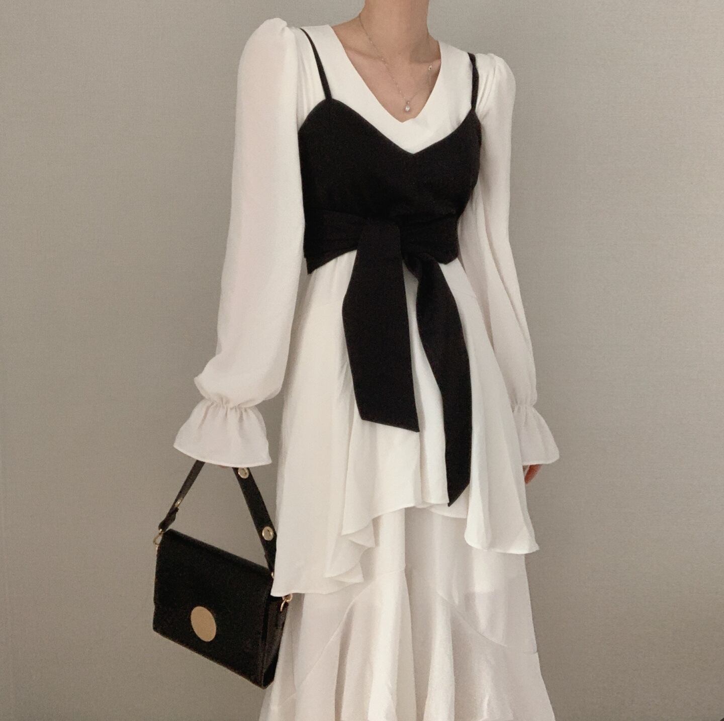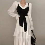 【セット】Vネック不規則フレアワンピース+リボンビスチェ ロングワンピース ビスチェ フリルワンピ スリムウエスト 韓国 シック 2カラー a2613