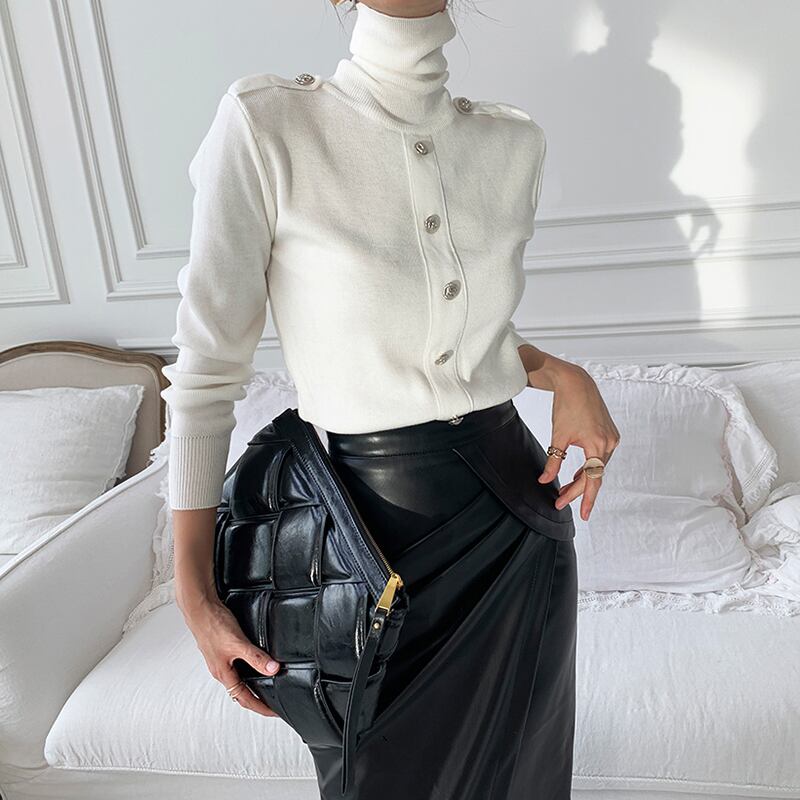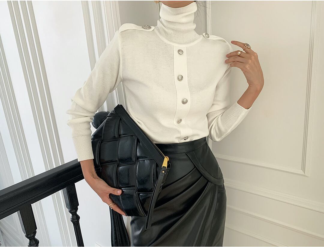 ハイネックニットセーター シングルブレスト エレガント 韓国 シック ニット セーター トップス a2615