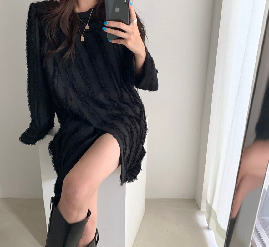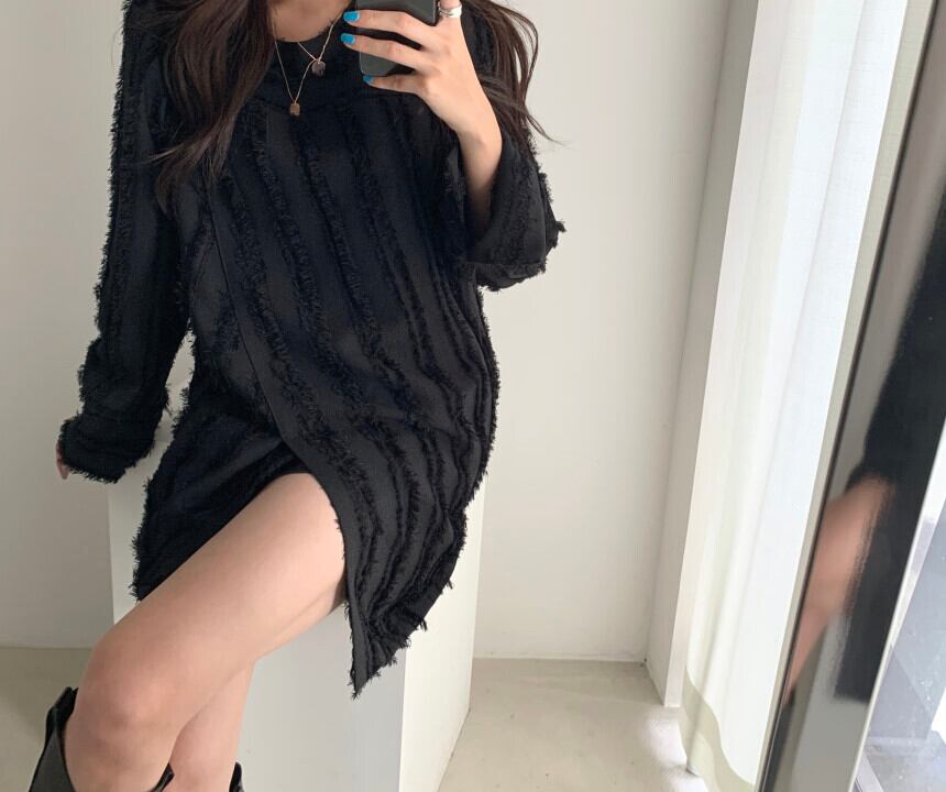フリンジエッジ長袖スプリットワンピース ラウンドネック ルーズ 韓国 シック ニッチ エレガント 2カラー a2619