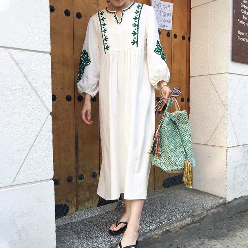 刺繍花ゆったりワンピース プリーツ ハイウエスト ロングオーバーニー ランタンスリーブ ドレス ワンピース 韓国 2カラー a2628