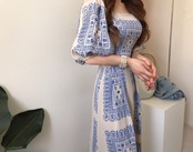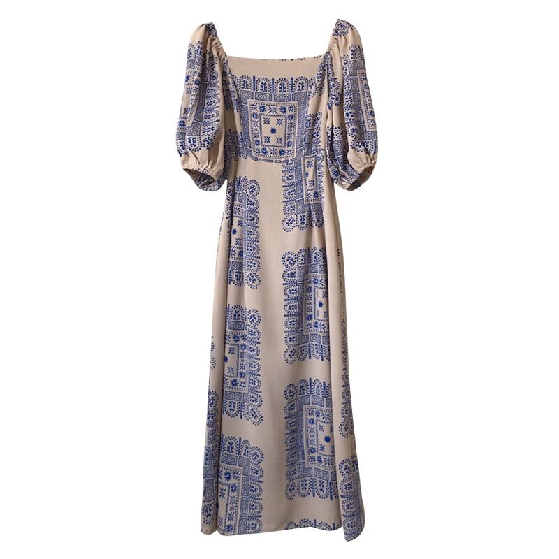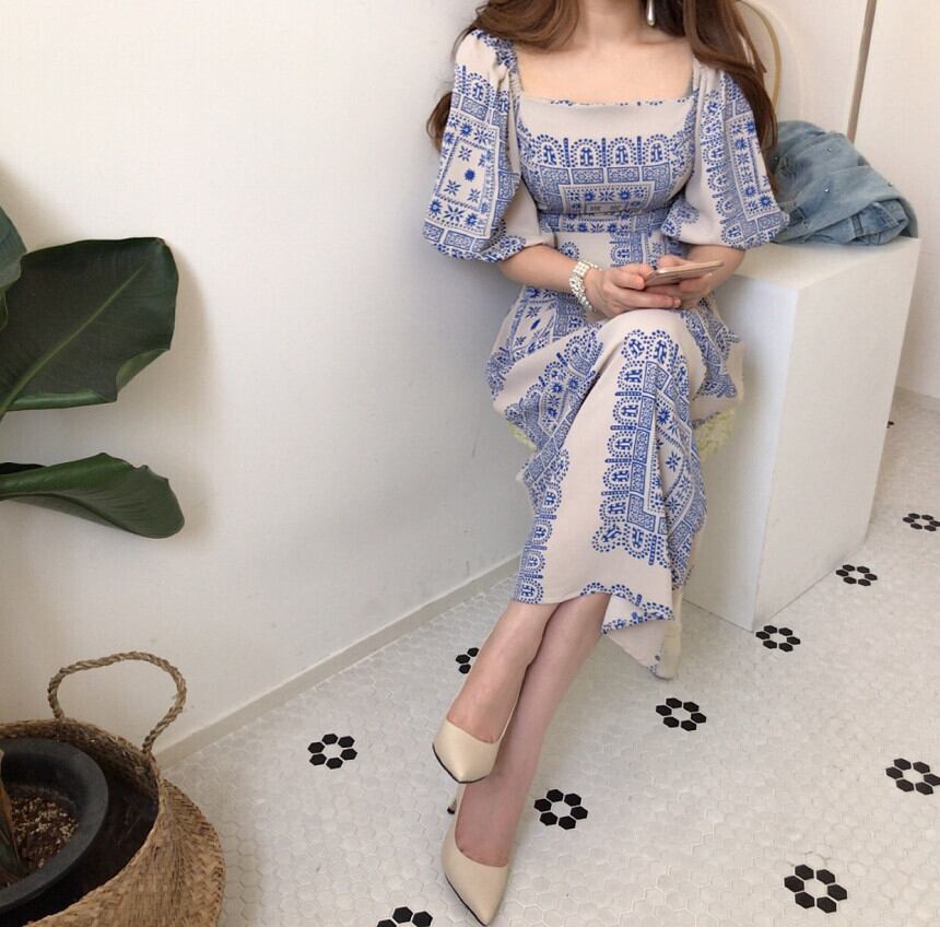 洋風プリントワンピース スクエアカラー ランタンスリーブ ドレス ロングスカート ハイウエスト 韓国 シック 鎖骨美人 a2631