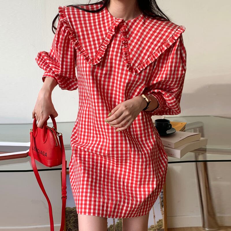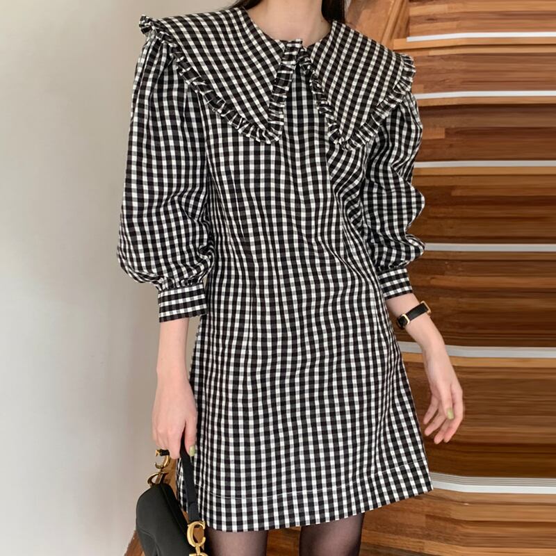 チェック柄ワンピース 襟ルーズ パフスリーブ ミドル丈スカート 長袖ワンピース 韓国 シック 春 夏 秋 a2644