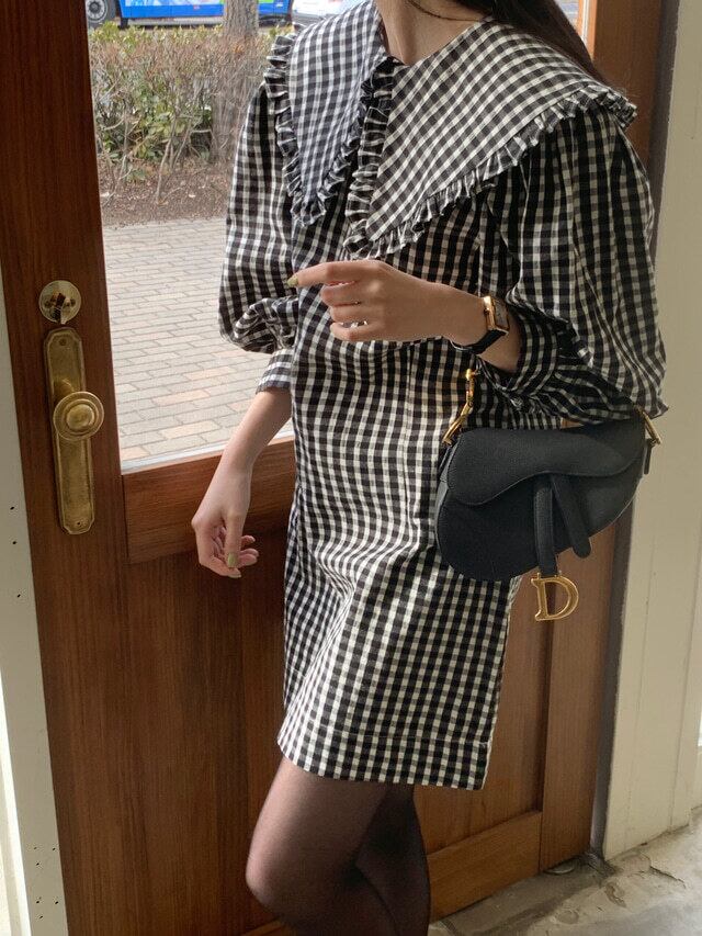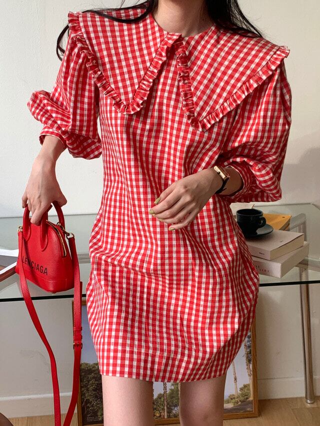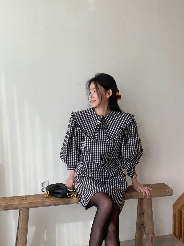 ルーズな襟が印象的なチェック柄ワンピース