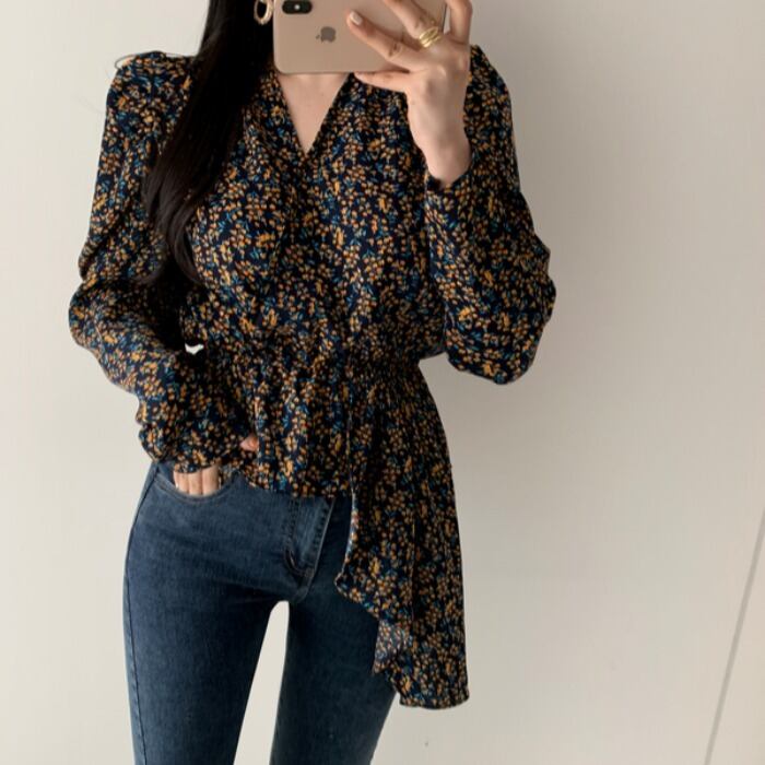 Vネックフラワーブラウス パフスリーブ アシメントリー シフォンブラウス 花柄 韓国 シック 春 夏 秋 2カラー a2650