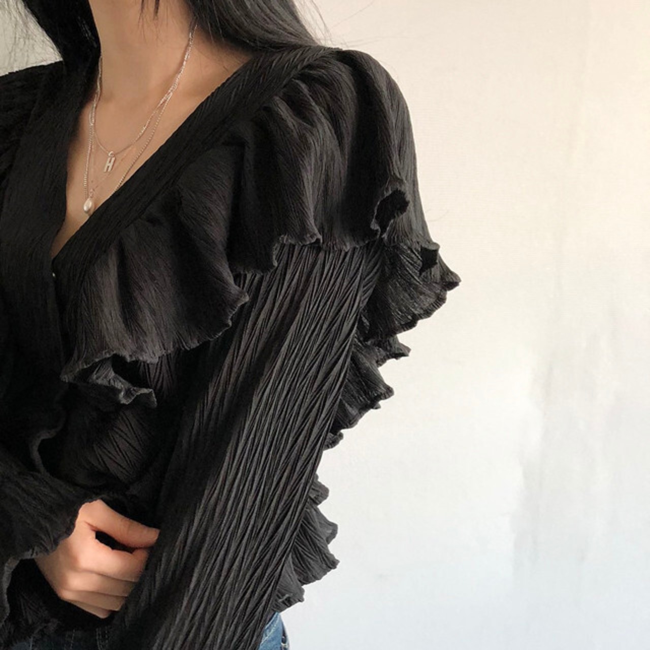 Vネックフリルブラウス シャツ フリルステッチ ハイウエスト フレアスリーブ シャツ トップス 韓国 シック 2カラー a2656