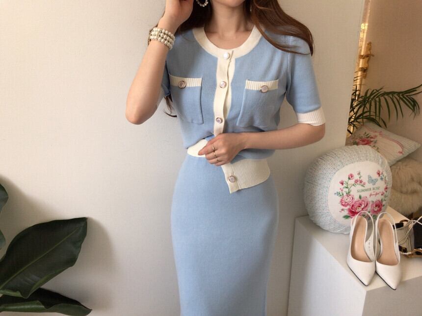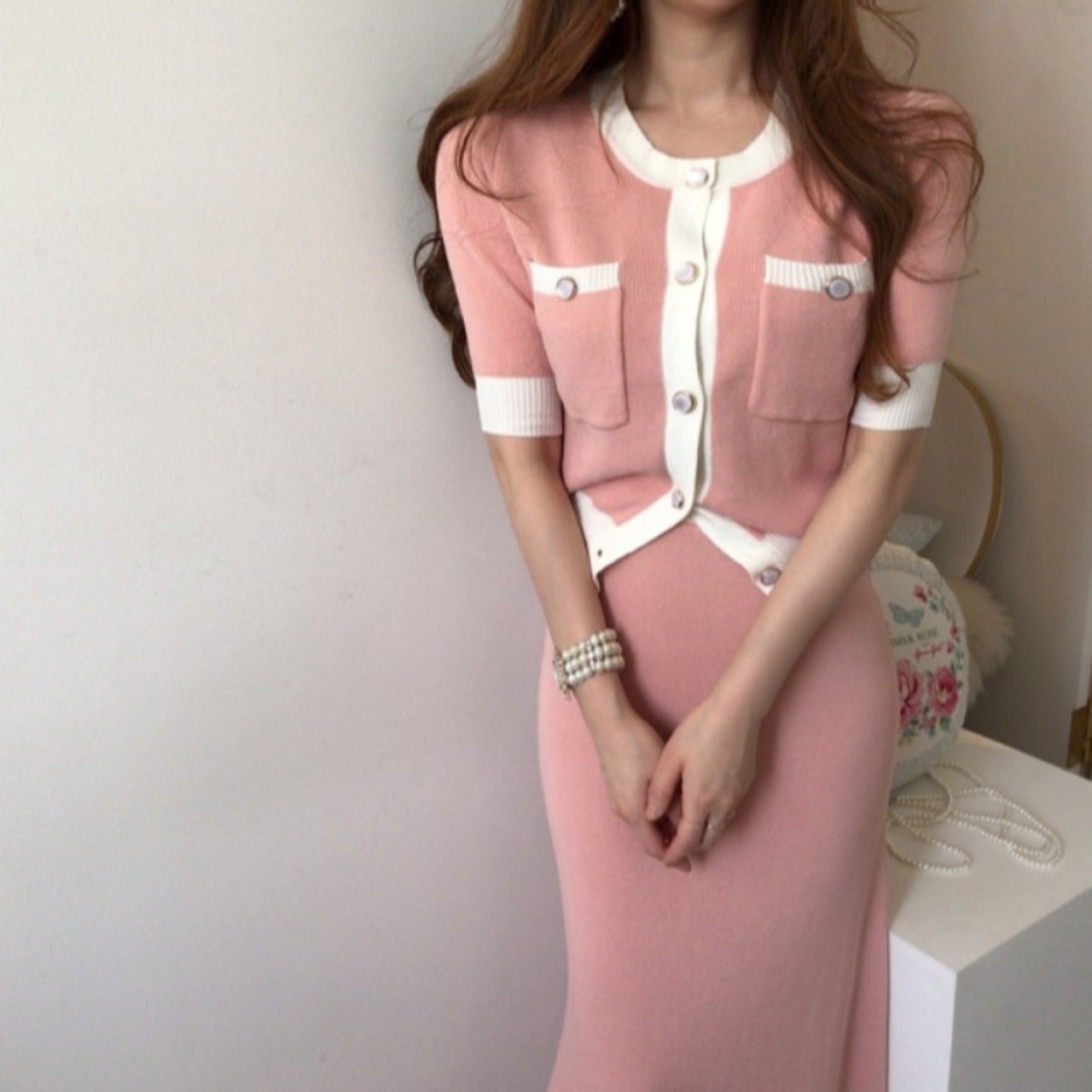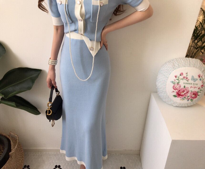 【セットアップ】半袖セーター+ハイウエストスカート ロングスカート スーツ ツーピース ニットアップ ラウンドネック 韓国 シック 3カラー a2661