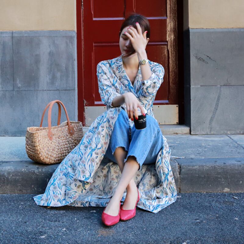 Vネックシフォン長袖ワンピース シャツロングスカート ウエストスリミング フラワーワンピース ハイウエスト ワンピース フラワーデザイン a2571