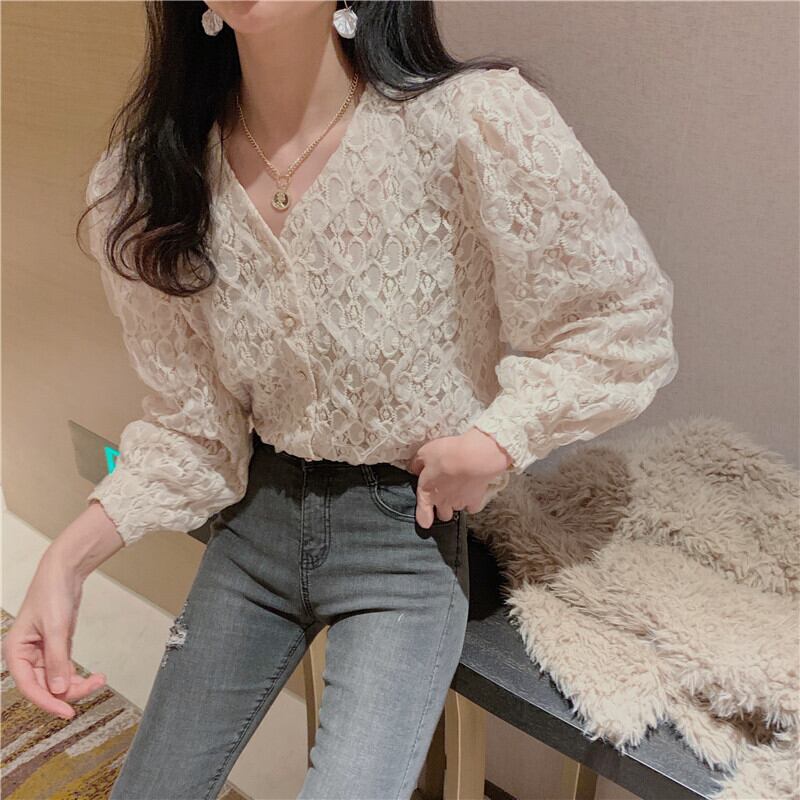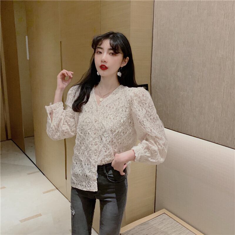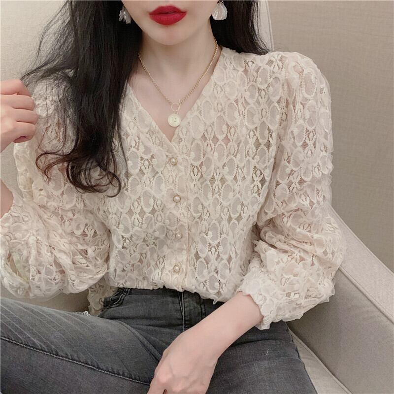 Vネックレースブラウス メッシュレースシャツ レディース Vネックカーディガン トップス 韓国 オルちゃん 春秋 a2693