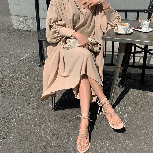 イレギュラースカートとランタンスリーブがオシャレな長袖シャツワンピース