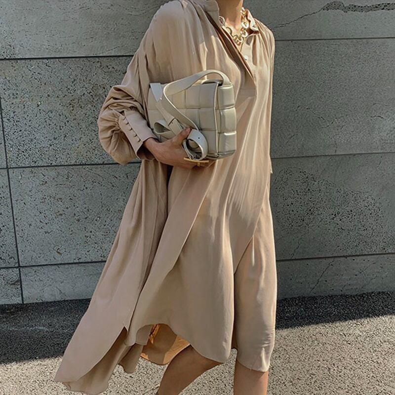 長袖シャツワンピース ワンピース シャツワンピース ルーズ ミドル丈 ランタンスリーブ 韓国 オルチャン 2カラー a2861